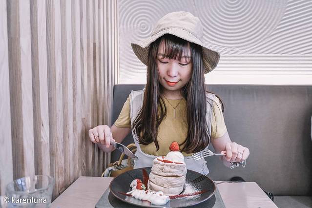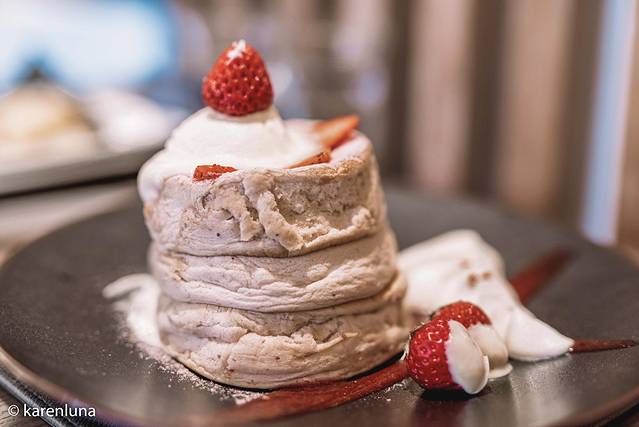 初春的季节限定是酸甜味道的草莓松饼,三层超级厚的粉红色松饼端上来时左右摇晃着,看上去DuangDuang的超级Q弹。因为里面加了Ricotta Cheese,所以松饼可以说是入口即化奶香十足,再配上酸甜的草莓,口味层次更加丰富。入口之前,混合些许淡奶油,甜而不腻,让人大快朵颐。不过每份松饼都有厚厚的三整块,一个人全吃光还是会有些腻,两个人分可以说是刚刚好。其实除了网红的原味松饼外,餐厅每个季度都会提出不同的季节限定,曾经在网上看到过栗子、蓝莓、巧克力、抹茶、紫芋等不同颜色不同口味的松饼,颜值和味道都在线,真是想把所有口味都品尝一遍!