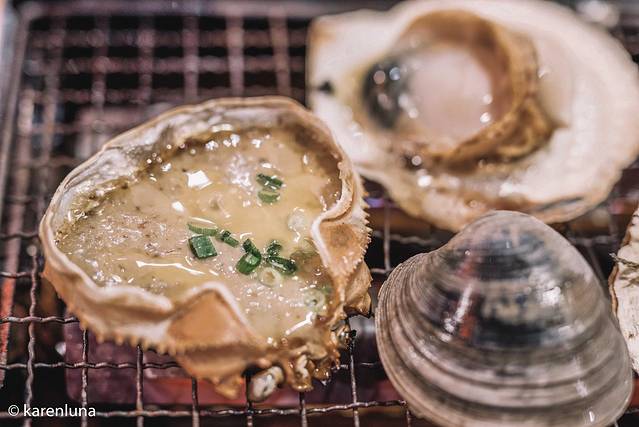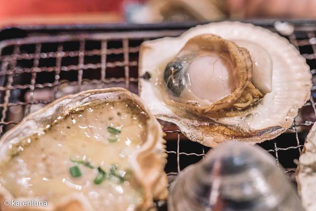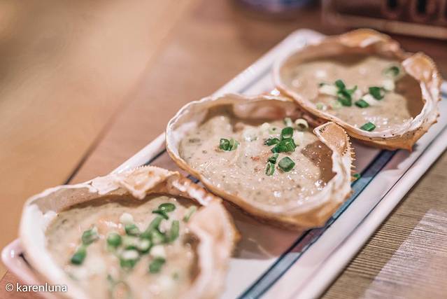 除了蟹壳烧外,每次必点的保留菜单那就是超级大的烤扇贝啦。巴掌大小一样的扇贝里,肉柱足足可以分两三口,而且几乎每一个扇贝都会有淡红色的扇贝黄。在火上烤5分钟,等待它自己弹开,剔除内脏在浇上酱汁,别提多鲜美了。口感超级Q弹肥厚,一点儿也不干涩。