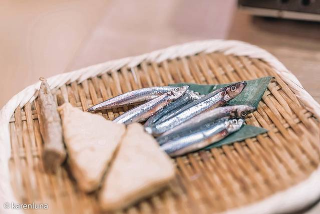 在正式上菜前,每桌都会先送一盘小份海鲜烧烤:几条小银鱼外加2-3块鱼豆腐,虽然量少,但是很解馋。特别喜欢吃这里的小银鱼,除了常规的新鲜外,最重要的是每条鱼肚子里都是满满的鱼子,每咬下去一口都超级满足。