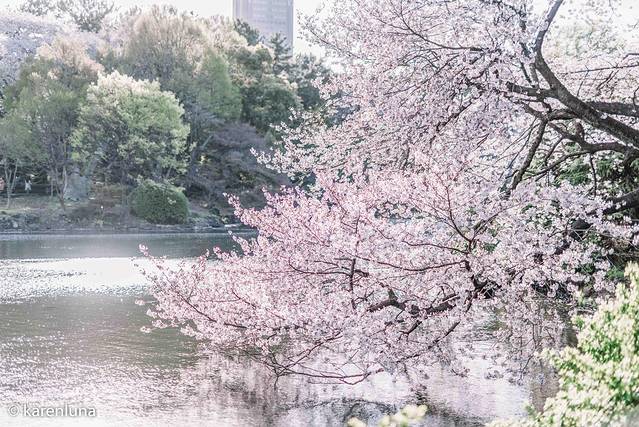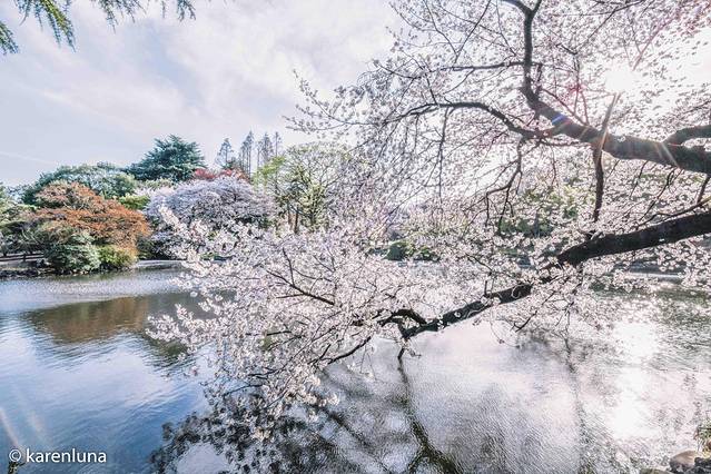 既然暂时拍不了无人的樱花美照,那就踏踏实实的在园区里随心漫步吧。作为街心公园一样的新宿御 苑里 ,有花有水有蓝天,真是 东京 居民不可错过的周末休闲的好去处。而院子里的樱花树时而两侧延伸生长像一把大伞,时而垂向湖面等风吹过时花瓣散落水中,画面唯美得犹如一幅油画,让人忍不住驻足拍照。