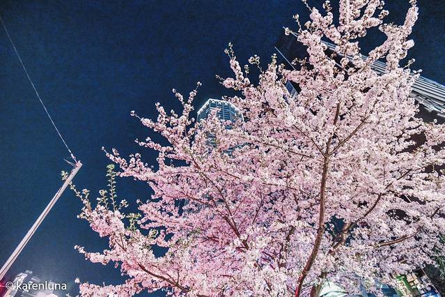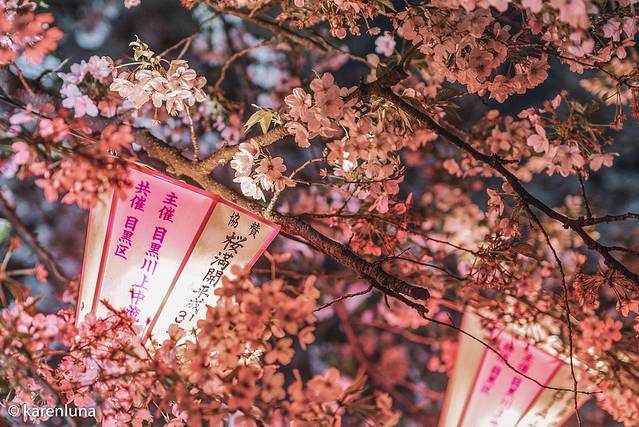 可能是周六的缘故,虽然还是上午那个熟悉的地铁口,但傍晚的这里却已经变得人头攒动。还没到目的地,通往目黑川水渠边的路就已经变得水泄不通,热闹程度绝对不亚于 中国 每年春节的庙会,用“人比樱花还多”做比喻,真是再贴切不了了!如果早上是在赏樱花,那么夜晚就是在看人吧。突然有点儿后悔,为什么刚刚在石神井川没有等到亮灯为止呢,同样是夜樱、同样是枝头满簇延伸到河面的满开圣况,但一个是鲜有游客,而另一个则是熙熙攘攘热闹非凡,想要拍张没有路人的樱花美景,还要排队等很久才能挤进里三层外三层的游客,夜樱人像美照可以说是天方夜谭了,与白天的体验感真是天壤之别!