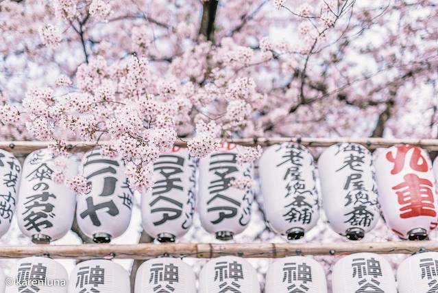 穿过桥头,肉眼可见的地方满是淡粉色的精灵们。水渠上,随风飘落的花瓣散落在水面上,顺着溪流形成唯美淡粉色的河川;树枝上,与樱花相呼应的白粉相间的灯笼点缀其中,随风舞动着的飘带肆意摇曳。