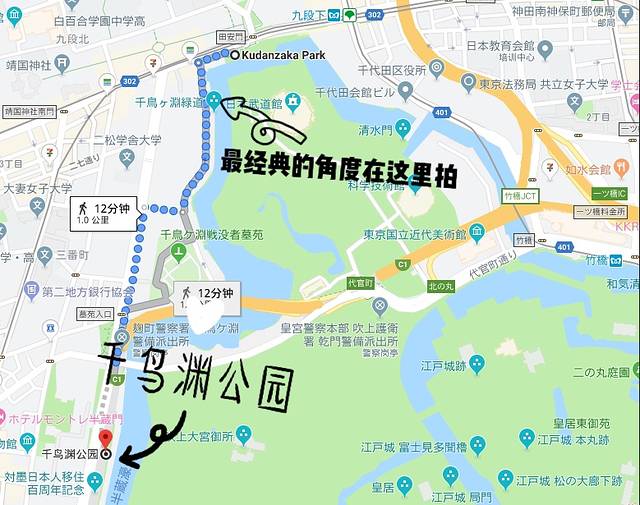 既然千鸟渊公园并不是网上火爆的千鸟之渊,那么寻找网红角度则是首要目标。于是询问了附近的工作人员才发现,原来那里位于北之丸公园外。