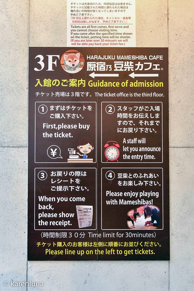 咖啡厅每天中午11点开门,如果想开门就进,一定一定要提前就来到这里排队买票。11点刚过就带着妈妈赶了过来,但没想到排队的人已经挤满了整个楼梯,队尾都排到了大街上,这种火爆程度真是让我惊呆。不过好在撸狗的时间被店里限制成了每场半小时,所以还算不会遥遥无期。排队也不是一直等着进场,而是买后面几场的入场券,售票处会根据客人的多少,在票面上提前写好入场的时间,如果时间长可以先离开逛逛街吃点儿小食什么的,提前10分钟再回到这里就可以了。