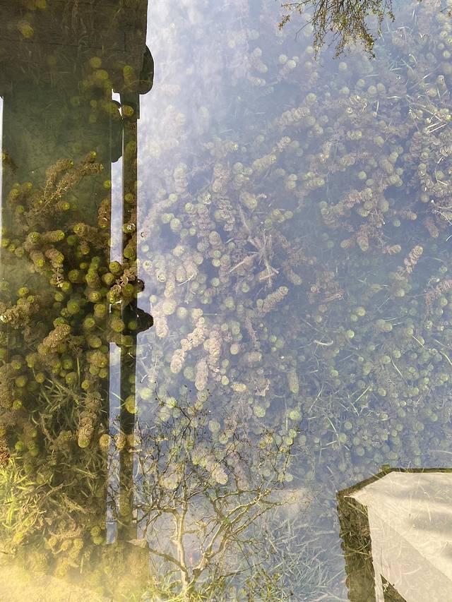 这里的山水还保留了人流如织前的那份宁静,看大门口池塘的水面,如明镜一般,可以看到蓝天,更可以看到内心。形状也如明月,月如钩,也成就了明月湾的来由。
