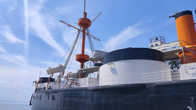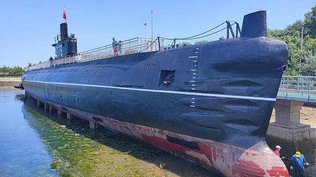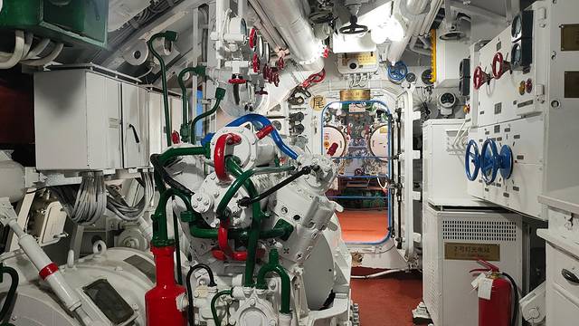刘公岛上的这艘潜艇是退役的R级33级279艇,是我国根据前苏联的技术制造成的第二代的常规动力潜艇。长是76.6米,宽6.7米,艇身分为首鱼雷舱,前蓄电池舱,指挥舱,后蓄电池舱,柴油机厂,推进电机舱等七个仓,可以核载57名军人。2003年,这艘潜艇光荣退役了,但是他见证了新中国潜艇事业的发展历史,并且这艘潜艇也是小朋友们非常喜欢的研学基地。在这里可以跟老师学习旗语,用不同的手势动作代表不同的信号,小朋友们在这里游玩也是乐此不疲。