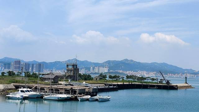 在刘公岛受海洋调节作用,岛内气候冬暖夏凉,全年平均温度在12℃左右,气候宜人,晴天的时候,连天白云连接清澈碧海,可以在沙滩漫步,在晨曦中观日,在黄昏中听海,享受一座岛屿一静一动的节奏。