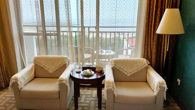 因为我们自驾到达时间已晚,决定还是先入住我们当天的酒店,月亮湾海景酒店。我们入住的房间是一个海景的双标间,房间里大大的落地窗,窗前轻轻纱飘舞,朦朦胧胧的看向外边,是无敌海景。阳台上还准备了迎宾的水果和甜品,能享受到这样的一个待遇,感觉还是非常的开心的。