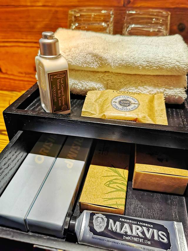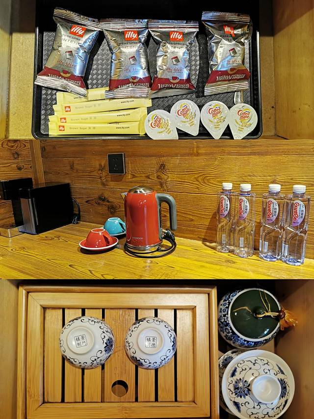 不二木居被称为“会呼吸的房子”,据说室内空气中含有大量的芬多精和被称为“空气维他命”的负离子,芬多精和负离子是现代森林浴者倍加推崇的物质,能有效杀死空气中的细菌、遏制病毒、增强免疫力,好像很适合我们现在这个时候入住。房间里的设施也是非常齐全的,干湿分离的洗浴间,从中式的茶饮到欧式的咖啡机,都一应俱全。打开猫王小音箱,放着音乐,听听歌、喝杯茶,还可以翻看一下随意摆在各个角落里的书籍,真的是非常的舒服。洗护用品也非常棒,都是欧舒丹的,连牙膏都是马尔斯的,真是太惊喜了,给人家一样的感觉!