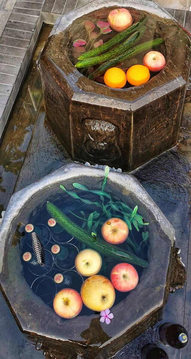 每家院子里边都有几个比较特别的水池,用泉水直接泡着饮料,黄瓜,西瓜。单看这种感觉就特别好,很有小时候夏天的情景,同时也成为起凤桥这些小院的一个独有的风景。