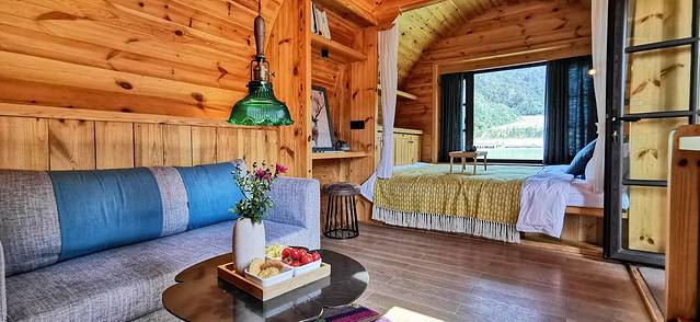木桶酒店,是由一个或两个像红酒桶一样的超大木桶构成,房间内有一张别有风情的榻榻米,清晨伴着阳光和微风醒来,感觉舒适又温馨。外面就是一片湖光风景,夜间可以观望星海苍茫,清晨可以欣赏九如山的日出风光。