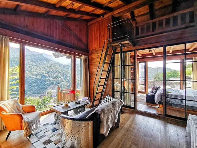 为什么要把寸光别墅放在最后一个写呢?就是因为我觉得这个别墅真的是太哇塞了。寸光别墅是相对独立的美式风格,三面环山、一面朝景,从外面来看特别的低调,但是一进到这个房子的内部就真的是令人瞠目咋舌!这是星级民宿当中的星级民宿,无论是从配套设施上还是从整个民宿的风景来说,都是无可挑剔的。悬崖之上,誉为眺望山河的绝佳之地,浮云之下,堪称疗养身心的不二之选。爱情、亲情、友情,在这里都显得尤为可贵。可谓一寸光阴一寸金,也许这就是他为什么叫寸光别墅的原因吧!寸光别墅也是loft的形式,上下可住6~8个人。在这里带上一家老小度假,或者是举办一个小型的party,都是非常合适的。既有全天热水、壁挂空调、爱慕睡衣、斯得福布草、一站式管家的服务,又有超大的室内外浴缸,洗去风尘仆仆的疲惫,星空之下举家共度浪漫休闲的时光。