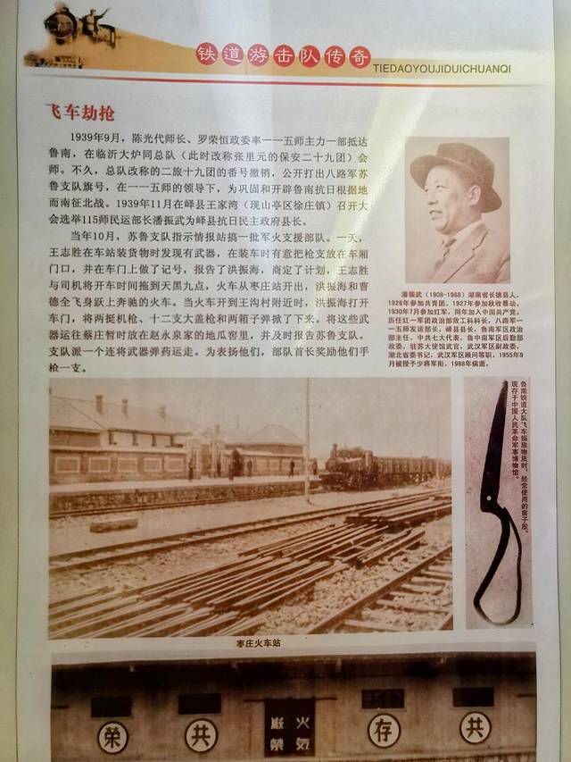 铁道游击队,是抗日战争时期活跃在山东鲁南地区(临城,峄县,滕县)的一支抗日武装。该游击队成立于1940年1月25日,受八路军苏鲁支队命令成立,成立时称“鲁南军区铁道大队”。是一支由中国共产党领导的、英雄的抗日武装力量,隶属于八路军“115师苏鲁支队”。该队以临城(今薛城区)为中心,依靠群众,开展游击战术,与日本侵略者展开浴血奋战,奏响了民族救亡的最强音。