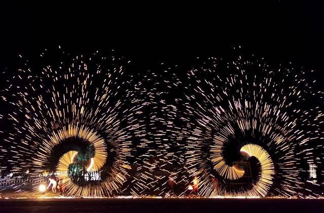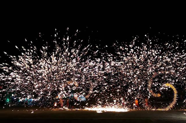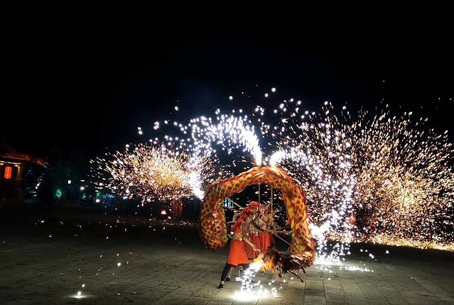 古城当晚还有打铁花的表演,这种古老的表演,已经是非物质文化遗产了,表演打铁花,需要足够的体力和勇气。看上去美丽的绚烂铁花,其实是过去劳动人民自娱自乐的智慧精华!