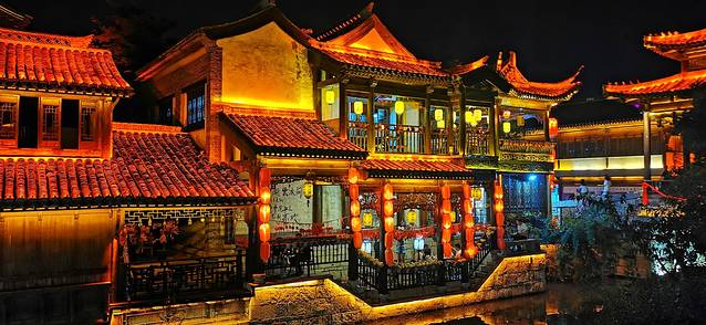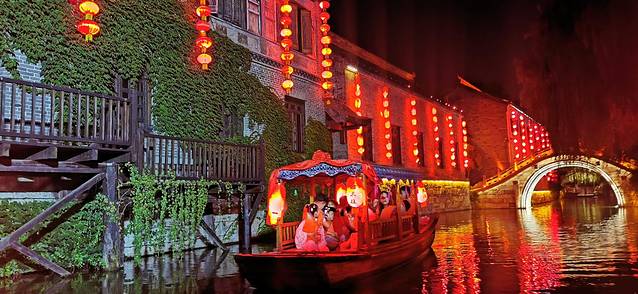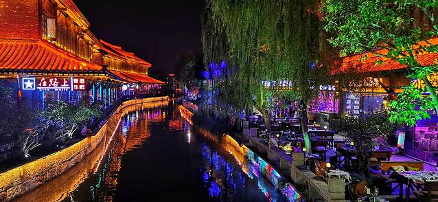 寻梦台儿庄,怎么能错过摇橹船呢?!不得不说,台儿庄的夜景真的是非常的美,是出片率极高的景点,乘着摇橹船穿行在古城的水道上,细看两岸的灯红酒绿,酒吧街上歌声此起彼伏,大家卖力的招揽着生意,是整个古城最喧嚣的时刻。