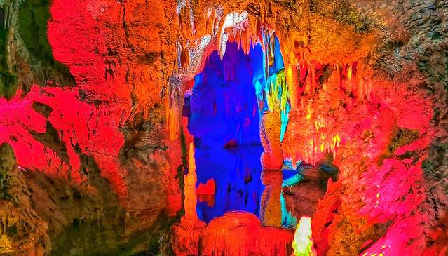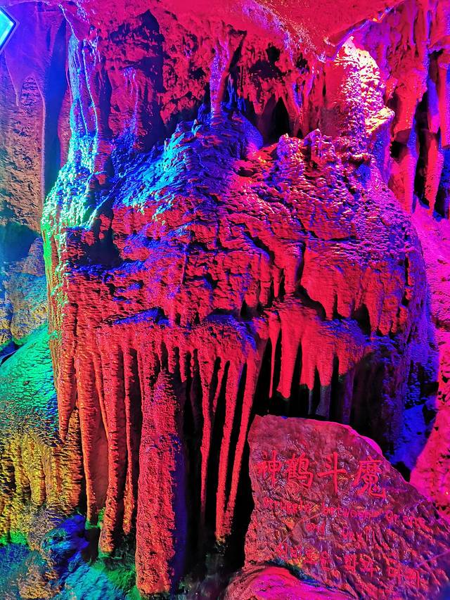 钟乳石经过上亿年冲刷,形成不同形状的景点,有些象形度非常高,有些就要在导游的讲解下你才能看得出其中的门道。但不得不说这里的钟乳石有的像飞鸟,有的是走兽,千差万别各自不同,配合着溶洞中五彩斑斓的灯光,光怪陆离,就像是臆想中的世界。
