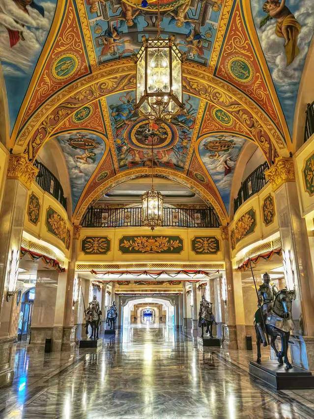 首先对我来说,酒店是旅行中非常重要的一个部分,只有休息好了,才有精力好好玩。我们本次入住的是蓬莱欧乐堡国际酒店。欧乐堡国际酒店分为三个部分,分别是欧乐堡国际酒店、欧乐堡骑士度假酒店,以及欧乐堡海洋度假酒店。我下榻的是欧乐堡骑士度假酒店。从外观上来看,整个酒店群是一座集合了欧洲多种建筑艺术的混搭风建筑。典型的拜占庭式的圆形穹顶,优雅线条的罗马柱拱券,还有酒店回廊里各种巴洛克式,色彩艳丽的彩绘壁画。每座酒店都有自己明确的定位和风格。