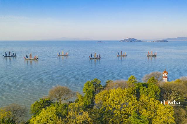 不得不说来的时候天气是真好,我还是第一次看到这么蓝的太湖水。再往里走,走到“鼋头”的位置,几条七桅帆船上的帆色都看得清清楚楚,后面的太湖仙岛也隐约可见。