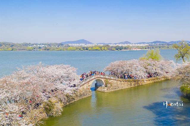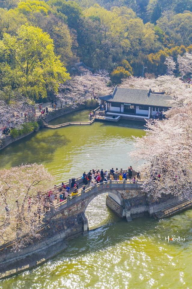 鼋头渚内的人气赏樱地大致有两块,赏樱楼和长春桥,若一早入园建议先去赏樱楼,因为时间太早长春桥那里背山还是阴面不太好拍。我就是先去了长春桥航拍,发现效果比较一般,后面去完赏樱楼又回来补拍了一下。长春桥可以说是鼋头渚最耐拍的地方了,不同的季节呈现不同的风景。造型仿佛北京颐和园中的玉带桥,湖堤上引种日本樱花,已有60多年历史。
