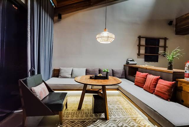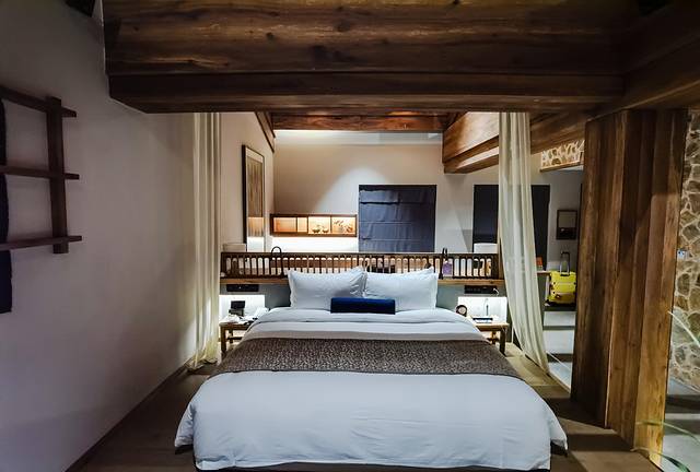 客房洁净清雅,整体以暖色调为主,搭配鲜艳的纯色点缀,空间层次感分明,将现代奢华艺气息与古典风韵精妙融合在了一起。民国风的古董元素,搭配上天然原木与原石,彰显古朴厚重。自动窗帘、感应式灯光照明,触控式化妆镜,乐视TV互动娱乐系统,环绕立体音响系统......智能生活体验和全方位的互动娱乐功能,诠释了精致与奢华的生活方式。