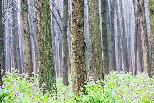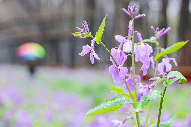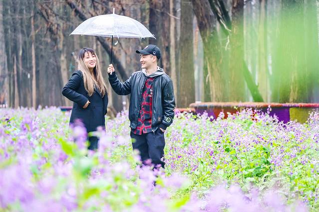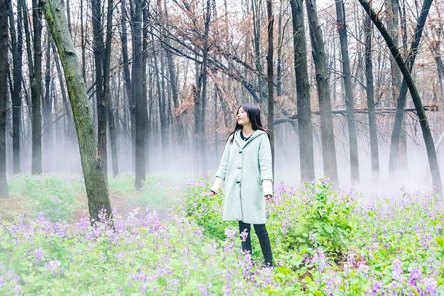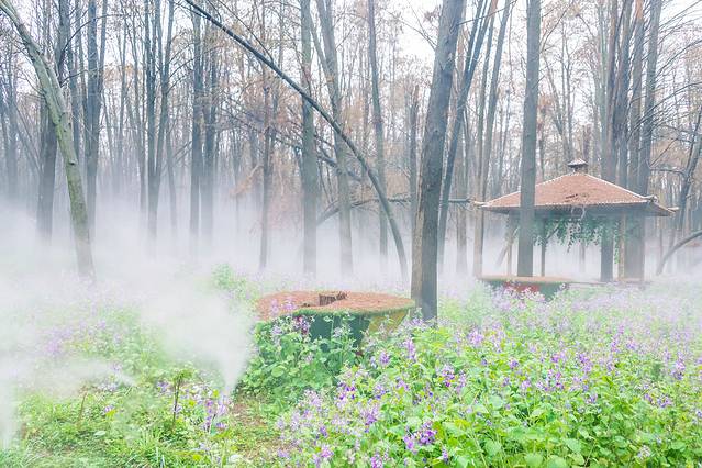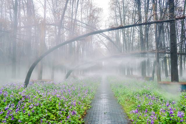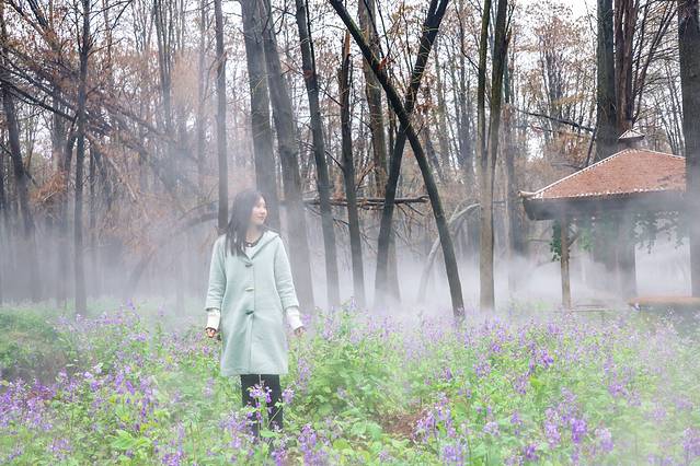 景区入口不远处即是雾森幻境。雾森开放之后整个森林仙气缭绕的,如梦如幻。置身于水杉林里,徜徉在二月兰花海中,谁还不是最美的小仙女了?雾森每天会定时开放,每次喷放时长有限,记得把握好拍照时间。