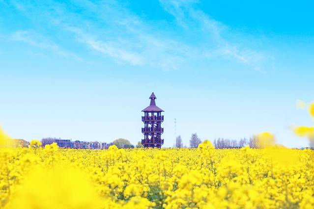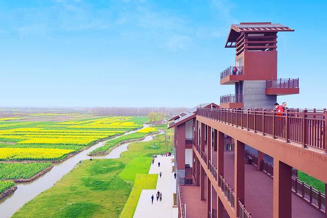 “走吧,咱们去观景台上看花海。”在导游小姐姐的带领下我们向观景台走去。观景台有好几层,越往上视野越开阔。从观景台俯瞰不由得感叹,千垛景区不愧是全球四大花海之一,尽管还没到盛花期,千垛景区已是一派盎然景象。阳光下的油菜花光彩夺目,明媚耀眼。春风吹拂,金色的波浪在垛田里翻涌着,蔚为壮观。
