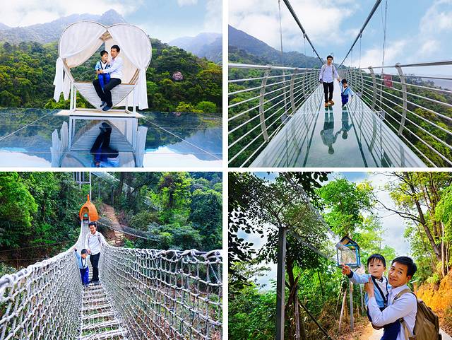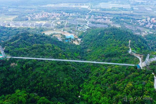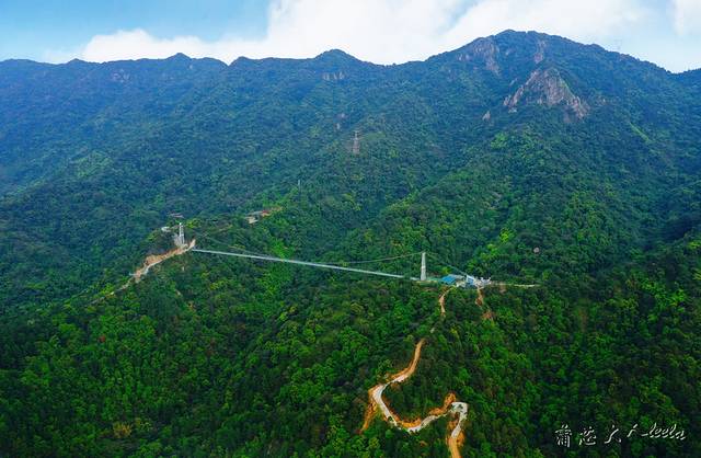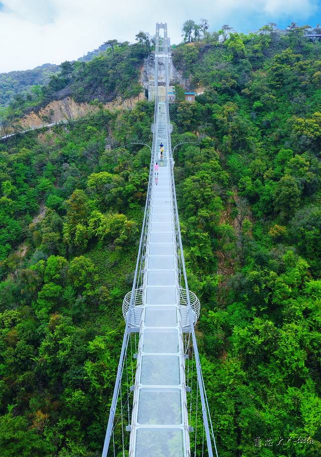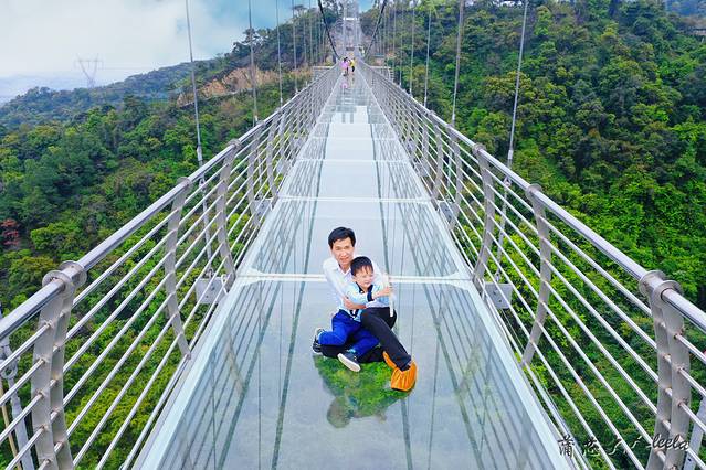 横跨两座山头的玻璃吊桥长达379米,足足有200多米高,是国内三大玻璃桥之一。玻璃桥背后是高山峻岭,远处是森林和南山镇美景,脚下是深邃的峡谷密林。