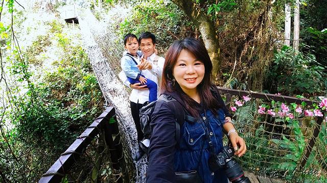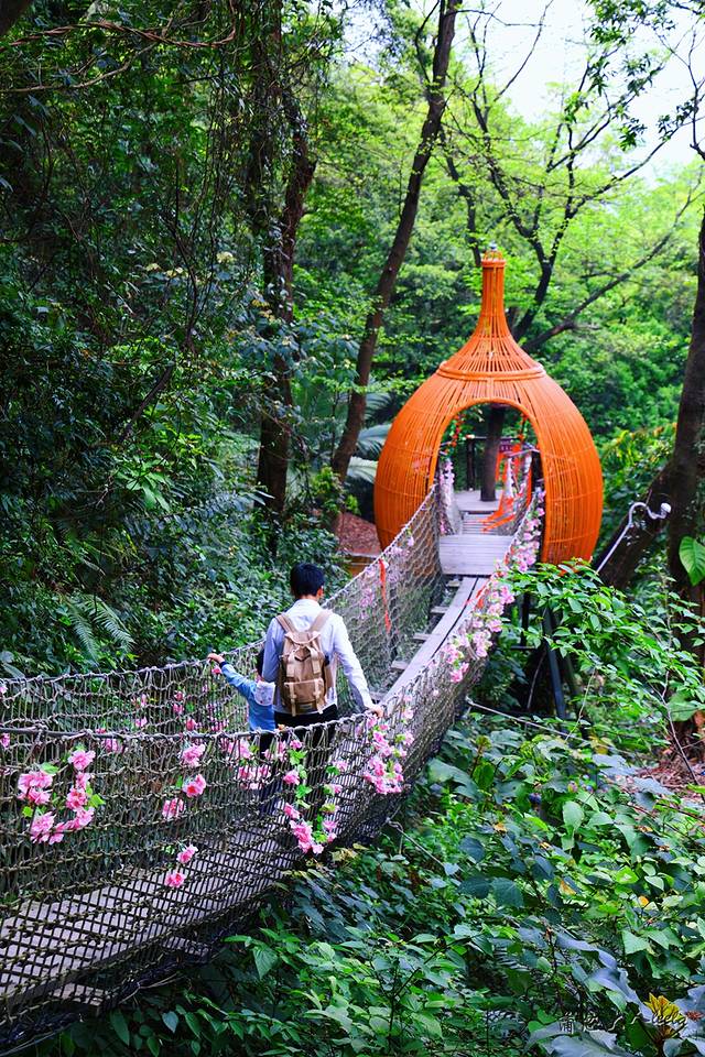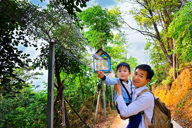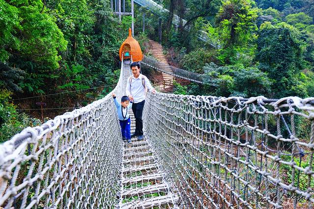 树冠长廊有点像闯关游戏,一路上吊桥和绳网摇摆不停,重心不稳要抓紧两边的绳索,宝宝一开始不敢玩,后来发现好玩又刺激,就跟我们走到了终点,非常给力!