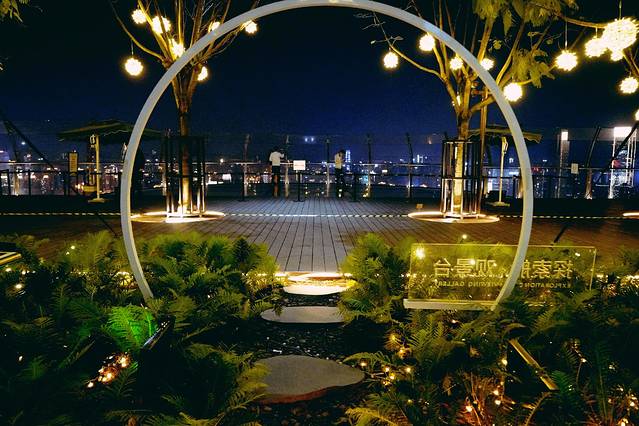 座位被树木环绕,绿色的树丛中闪烁着金色的灯光,像极了童话世界。