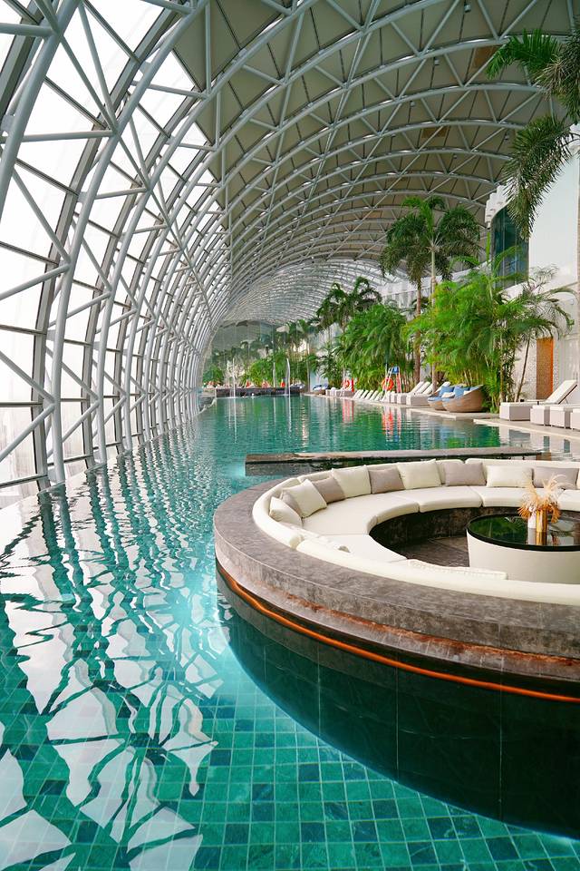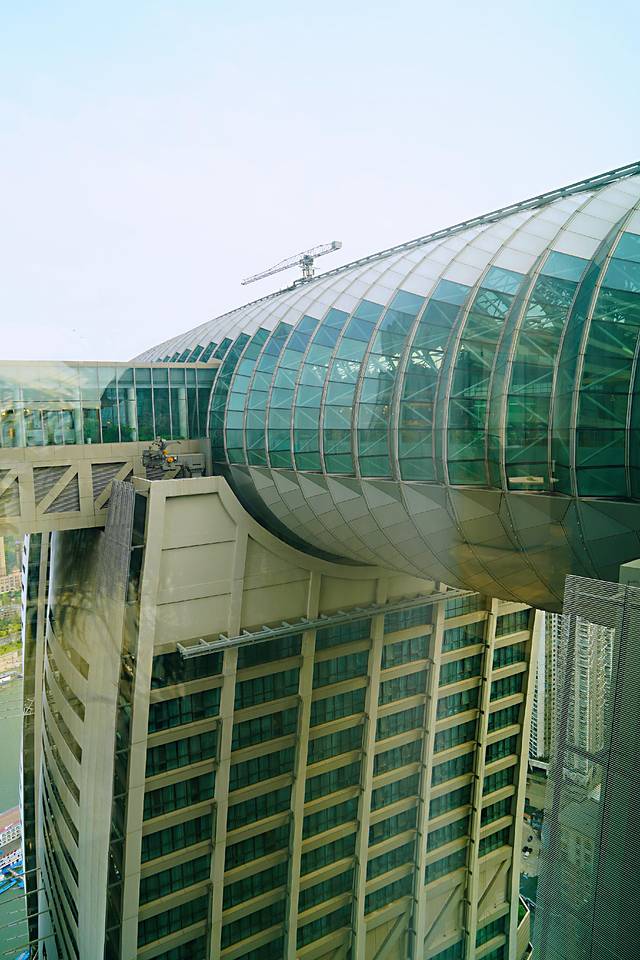 重庆来福士和新加坡金沙酒店出自同一设计师之手,所以外观看起来确实有点像。不同的是,由于重庆的气候原因,横跨重庆来福士4栋塔楼顶上的横向摩天楼多了一个玻璃穹顶,所以又被称为水晶连廊。