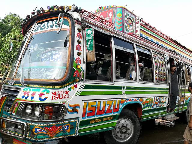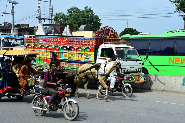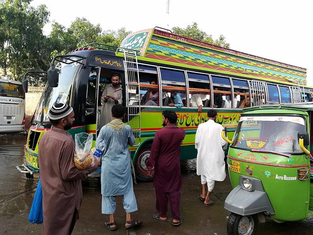 巴基斯坦的公共交通是男女分开坐的,男后女前,即女坐前边男坐后边,如果车上没女的男士可以坐但下一站有女士上来你得自觉让坐到后边去,后面没位置了就挂车外,车门挂两三后梯挂两三,都挂满了就上车顶行李架,都知道印度的车开挂,但在印度没见到挂车顶的在这里看到了,头顶车门车屁股挂满一车一路摇晃着伴随司机放的音乐勇往直前,哈哈,现在我不会怀疑有什么危险了,他们的司机开车技术才真叫牛,太牛了。