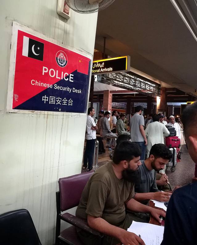 拉合尔国际机场很小,巴国时间零晨一点多准点到达(比北京时间晚3小时),入境手续就是盖个章那么简单,我只有一个背包不需要等待领取行李,也就很快走出机场大厅,门外持枪大兵站在出口两边目不转睛的紧盯着每一个入境者,外族人的脸孔立马引来大兵的注意,询问之下确认是中国人后大兵指着旁边的一张桌子改用中文说要登记,一脸愕然下这才留意到不远处一张桌子前坐着两个军人正在给入境的中国人登记,其后背墙壁上用中文写着“中国安全台”,登记啥意思搞不懂,也许是为了中国人的安全吧,登记完毕必须有住宿酒店方人员来确认护照才返还放行,而事先约好的住宿酒店老板还没来,那就随便看看这环境,大半夜的机场外除了昏暗路灯啥也看不清,机上下来的乘客基本有车来接。