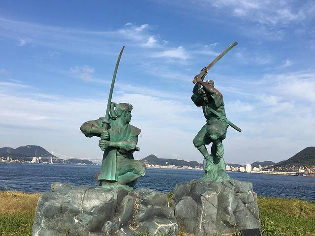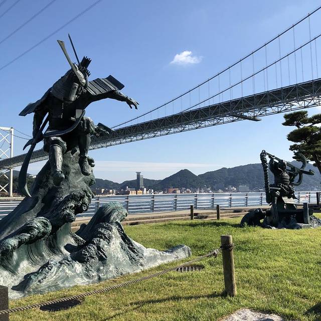 关门海峡边的公园,可以眺望海景和关门大桥。在海边有复制的长州大炮,这炮还能开,扔个硬币进去就响,不过只有声音和烟。这里还是当年源平治乱的最后一站,坛之浦之战的古战场,所以源义经和平知盛的雕像一个不少。