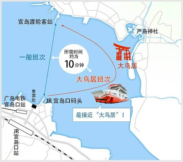 大鸟居班次:9:10~16:10之间出发的渡轮都是最接近大鸟居的。