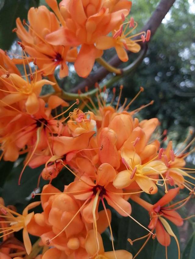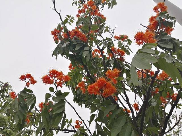 无忧花是常绿乔木,枝叶浓密,花很大,花色橙黄,花丝突出。它花开光耀,盛开时远看就如同一团团燃烧的火焰,所以又名火焰花。
