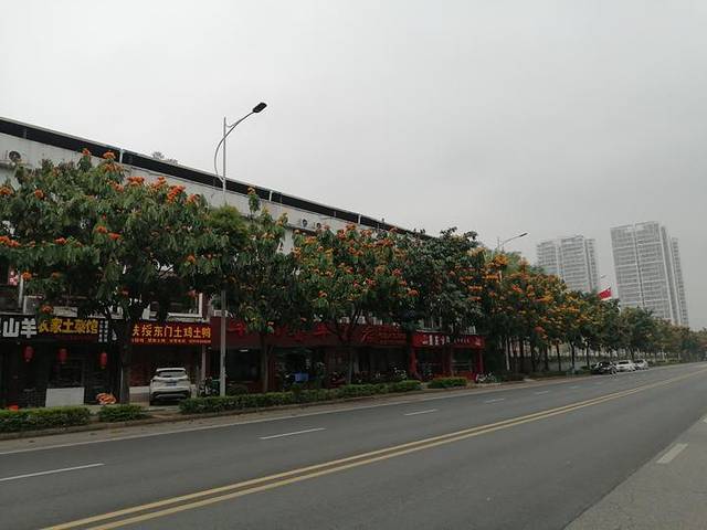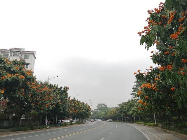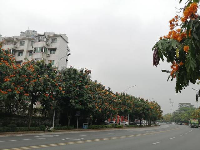 在南宁相思湖西路,最近这段时间正是无忧花开花的时节,路两旁开满橙黄色的花,橙黄橙黄的一片片,一丛丛的,像火焰一样,美得不像话!为行人带来无比祥瑞的色彩。