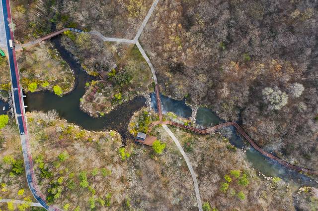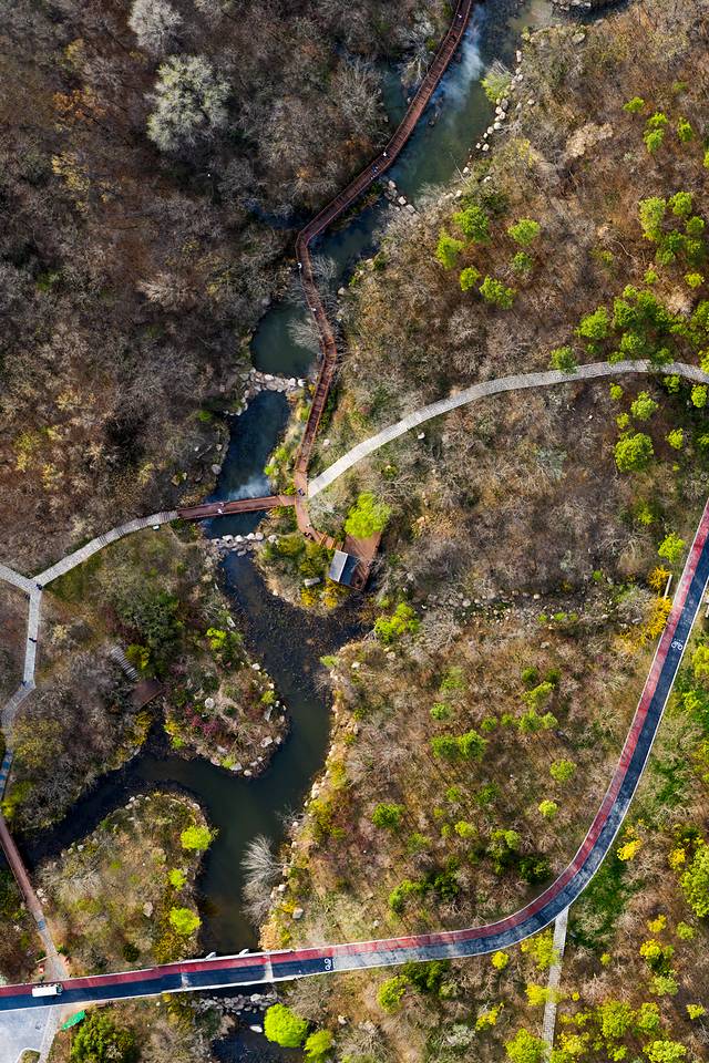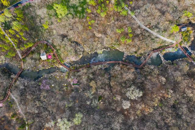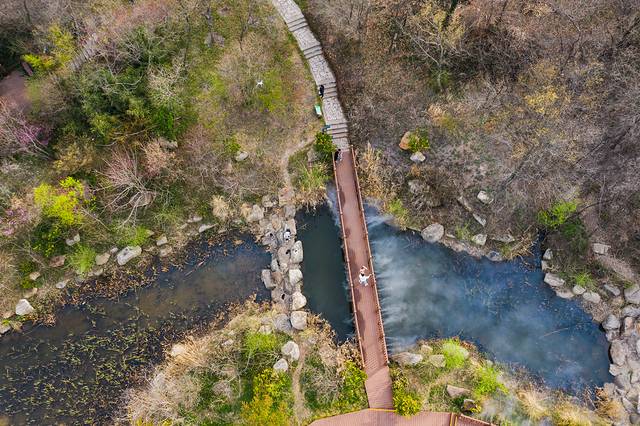 沿千米木栈道缓步而行,两侧是初吐嫩芽的林,林中鸟低吟浅唱,哼唱的是春之舞曲,一条小河潺潺流淌,乳白色的雾从河面上飘起,那山、那林、那栈道、那人也从清晰而变得迷离,迷离了双眼,醉了时光。