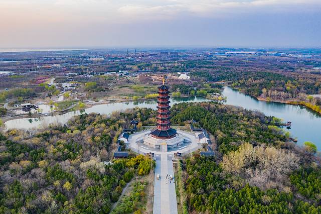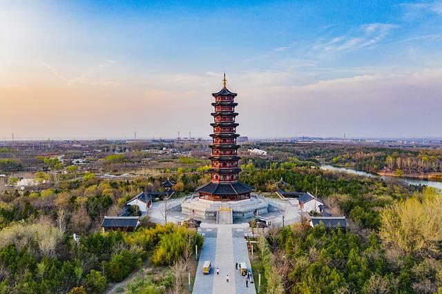 苏北第一塔天和塔,主体为宋代建筑风格,塔高66米,八角九层,占据天时、地利;塔体钢筋混泥土框架结构,外立面采用木材装饰。