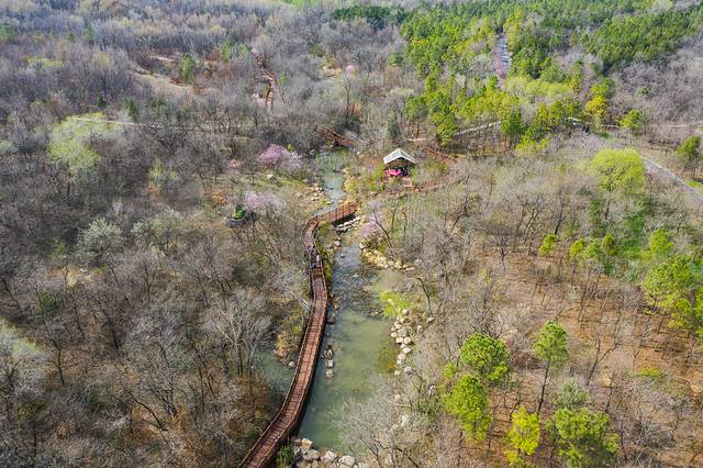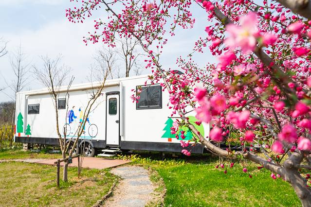 沿着小河溯流而上,穿过曲折的街巷,流水潺潺,鸟语花香,这座“黄淮海地区的最大氧吧”里是桃红柳绿,有着百花的芬芳。树屋、房车营地就掩映在盛开的花丛中,三台山真的很大,从整体看来,那一栋栋雅致的树屋,那一辆辆充满了现代气息的房车,又错落有致的点缀于其间,整体而又和谐。想来住在其中,坐看风起云涌、花开花落,也是别有滋味了。