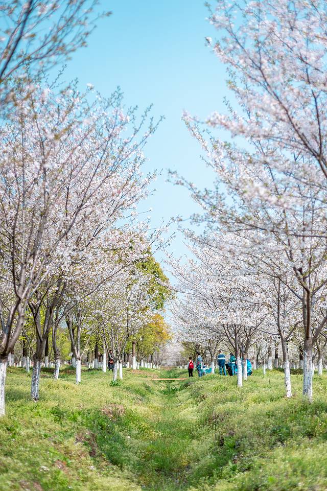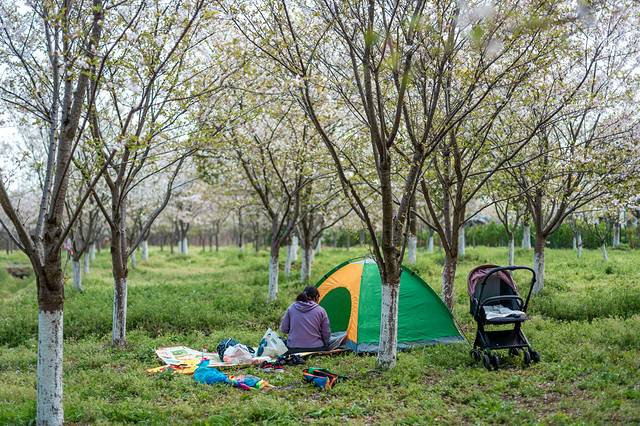 青青的草地,粉色的花朵,蓝蓝的天空,很是唯美,租上一辆自行车与家人朋友在这里骑行是多么惬意的一件事情,还有不少家庭在樱花林里露营,画面真的很美,幸福快乐洋溢在脸上,搭个帐篷野餐真的是一件很美的事情,美景配美食,好好享受这大好的春光。