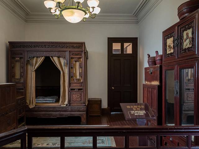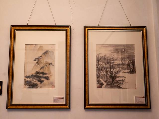 出了门,有木板楼梯通往二楼,楼上走廊里悬挂着陆小曼的国画和书法,真不愧是才女。二楼主要是卧室和书房,这里有徐志摩母亲的卧室,隔着窄窄的走廊,对面是张幼仪的卧室,据说他们离婚后,徐志摩的父母一直把他当做女儿,所以这里还保留着她的卧室。
