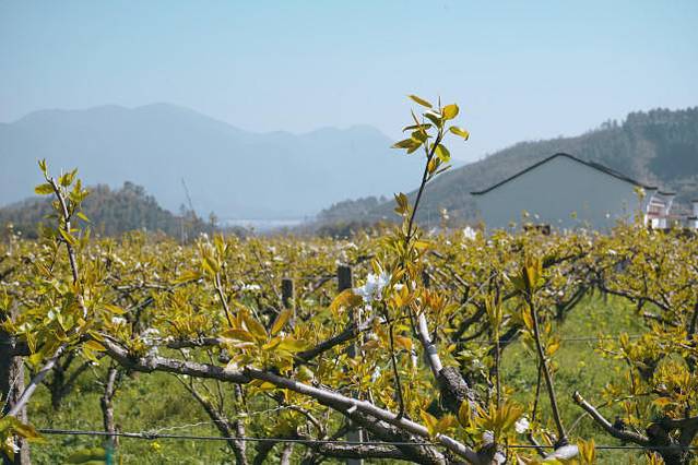 而现在,鸬鸟镇正举办着2021杭州鸬鸟山花节暨鸬鸟户外季,满目翠绿,上星期,我去到这个素有“蜜梨之乡”美誉的鸬鸟镇时,很幸运地遇见这里正开满了一整片的梨花树……