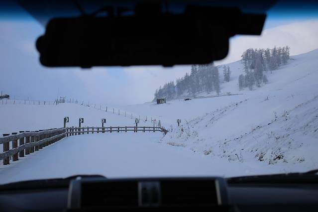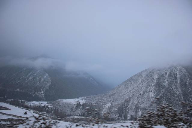 注意:下雪天的喀纳斯行驶很危险,而且都是山路,十八弯,我们去的路途中突然就下暴雪,因为我们开的是有雪地胎的越野车,所以就算雪天也不怕打滑,如果是自驾的小伙伴请注意,不是雪地胎的话大雪千万别行驶,行驶在我们前面的牧羊人的车就是因为车轮不是雪地胎,还行驶在路上导致刹车刹不住而出车祸,所以出门在外还是要安全第一。