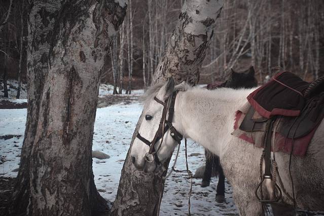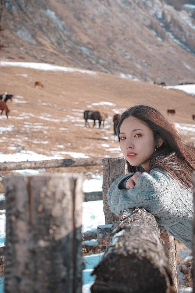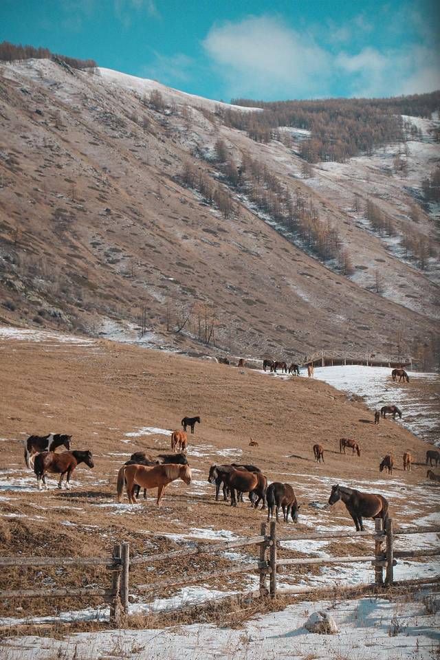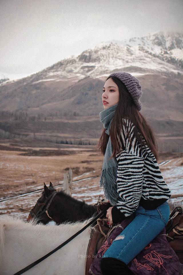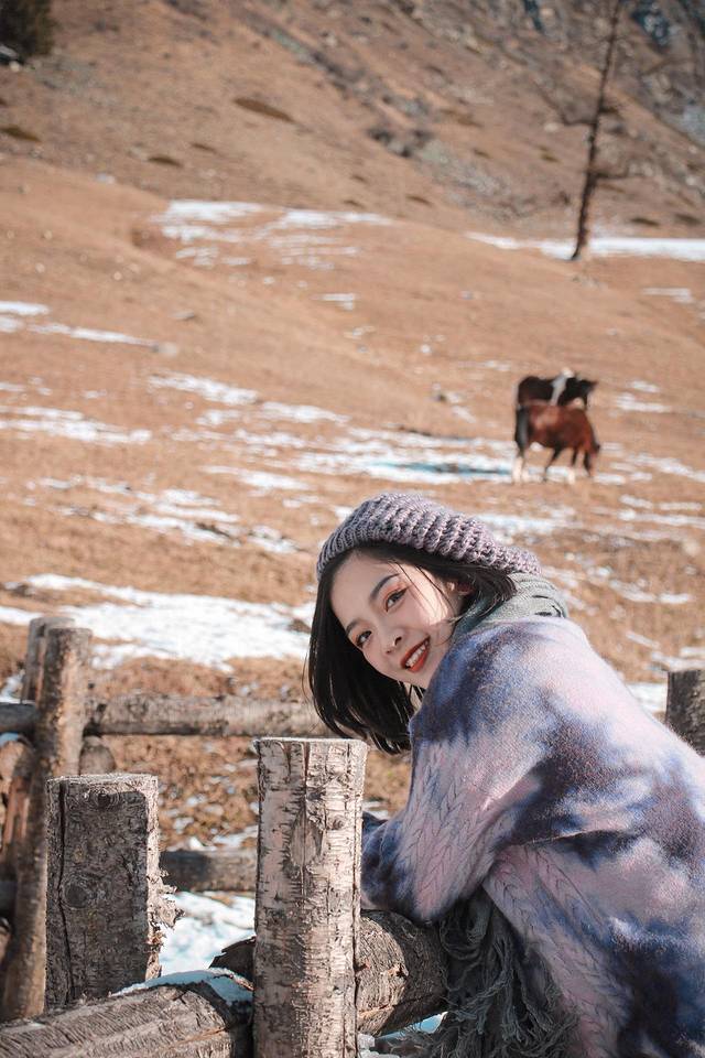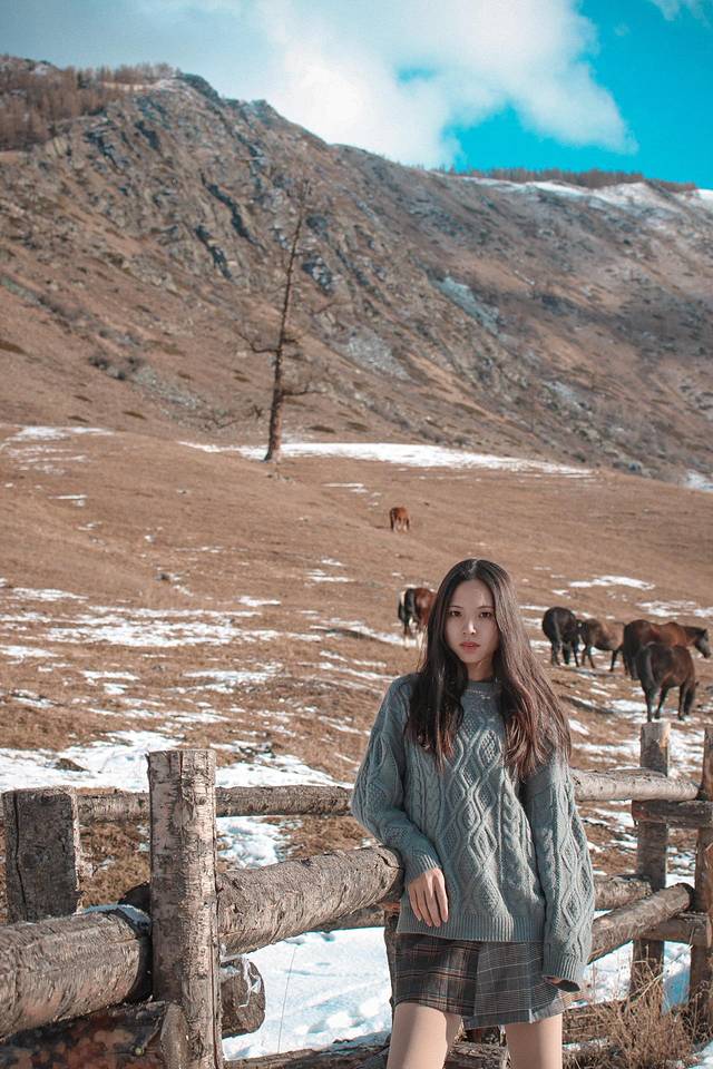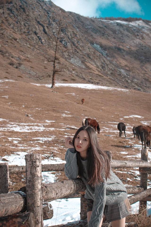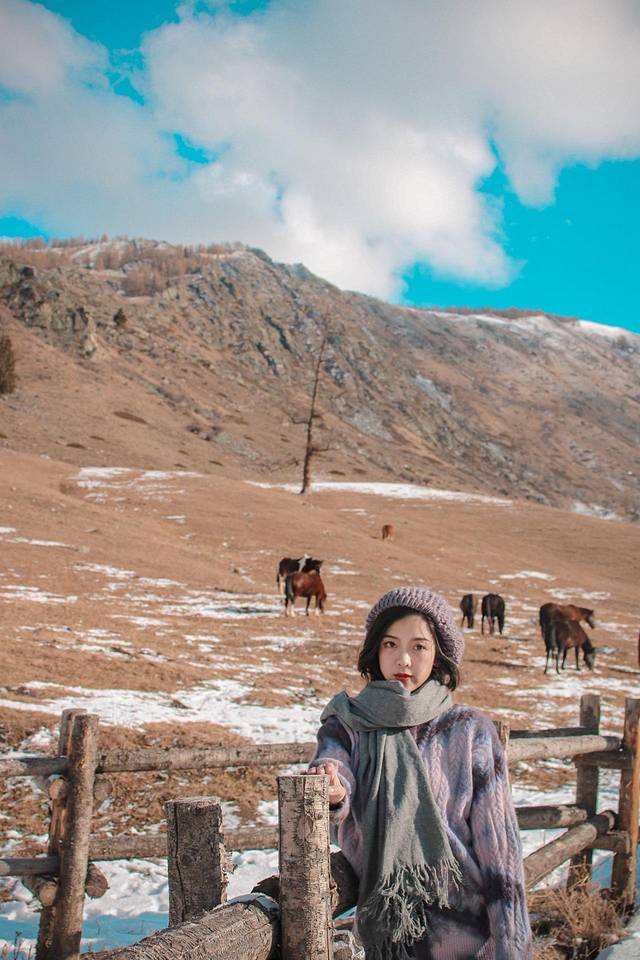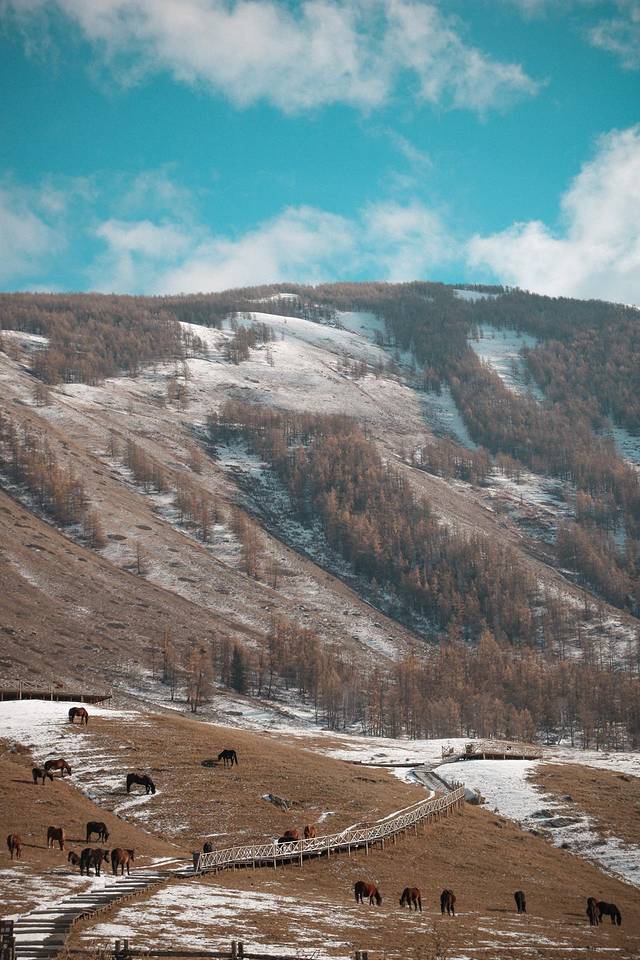 可能当时下雪,而且没有阳光的照射,所以感觉跟喀纳斯湖差别不大,倒是在神仙湾的对面,发现了隐藏着的惊喜,一个宽阔 的马场大草原,一望无际的枯草,加上成群的马儿以及远处的雪山,倒是十分让人惊喜,也是拍照的隐藏特别机位。