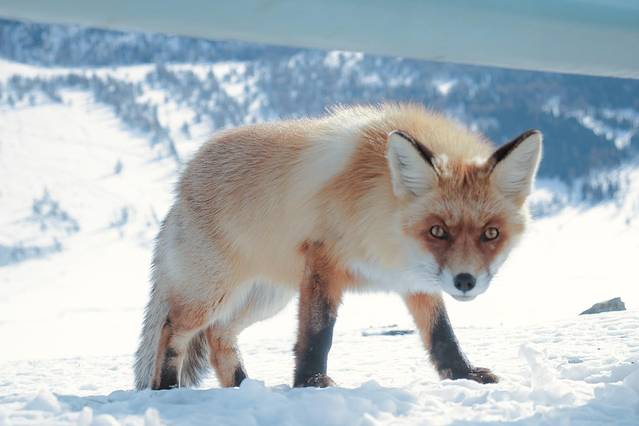 于是我们靠边停车,车队小哥哥说这边的狐狸都不怎么怕人,虽然是野生狐狸,但经常会有游客喂他们,他们也不会凶人,于是我们赶紧在车上拿了几个鸡腿,下车喂狐狸去。