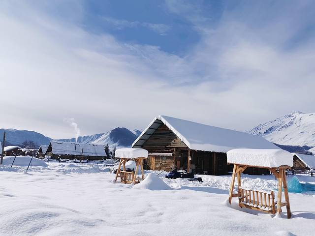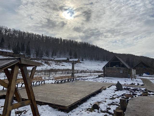 来禾木有点遗憾的是,刚好这两天天气有点转暖,所以看不到这种堆满厚厚积雪的小木屋,只能借车队小哥哥的图给大家看看下着积雪的禾木。