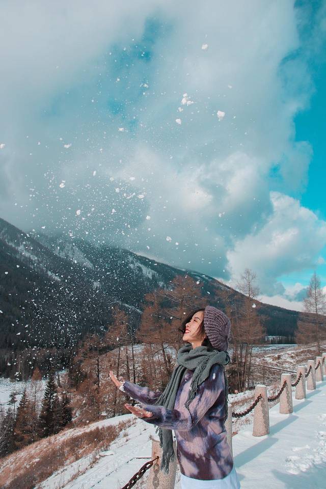前往喀纳斯湖的路上,会看到有很多积雪很厚的空白区域,领队小哥哥问我们要不要打雪仗,二话没说,我们找个地方靠边停车就开干。