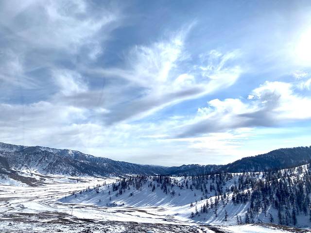 第四天环北疆之旅,从禾木出发前往喀纳斯一共2个多小时,一路上一片白雪皑皑,厚厚的积雪,汽车行驶在堆满积雪的公路上,好似踩在柔软的棉花糖一样,那一条干净的压痕,对强迫症患者来说绝对是舒服的存在。