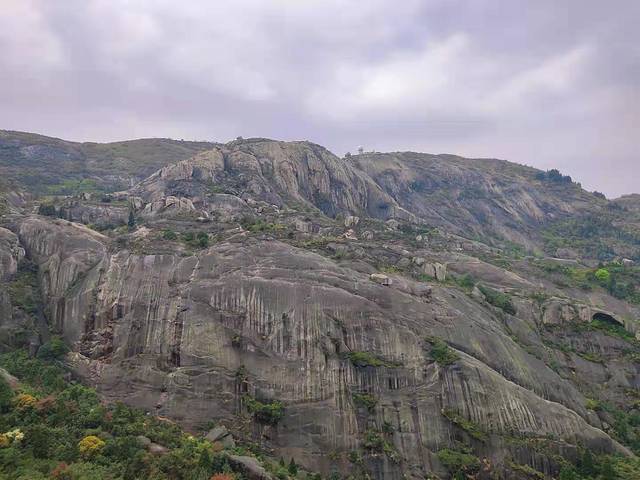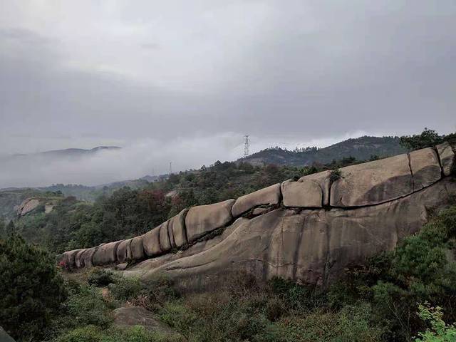 因其形状酷似龙的脊背而得名“龙脊”,龙脊是23块形状相似的岩石组成,长约40米,宽约5米,高约8米,是典型的花岗岩地貌。