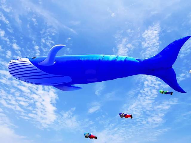 风筝大放飞表演,海洋特色风筝等竞相飞翔,在天空中追逐、嬉戏,天空蔚蓝,云与风筝一同舒展,天上的风筝神奇又美丽。